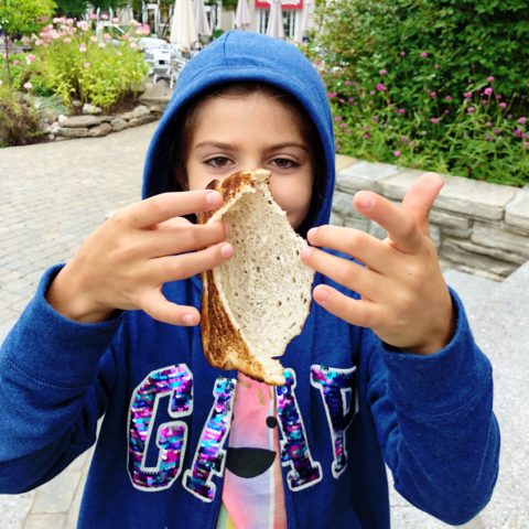 Then we stopped at Queues de Castor for a Beaver Tail, something we missed on our last trip to Mont Tremblant. A Beaver Tail is fried dough in a flattened oval shape with powdered sugar on top. They also serve it with various toppings like bananas, Nutella and Reeses Peanut butter Cups, but we were told to try the original. Mazzy didn’t want to try it at first, but once she learned it wasn’t a real Beaver Tail (I guess I should have mentioned that earlier when I was trying to sell it), she was game.