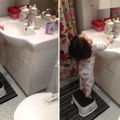 A few days ago, we got a step stool for the bathroom so Mazzy can reach the sink and she is over the moon excited about it.